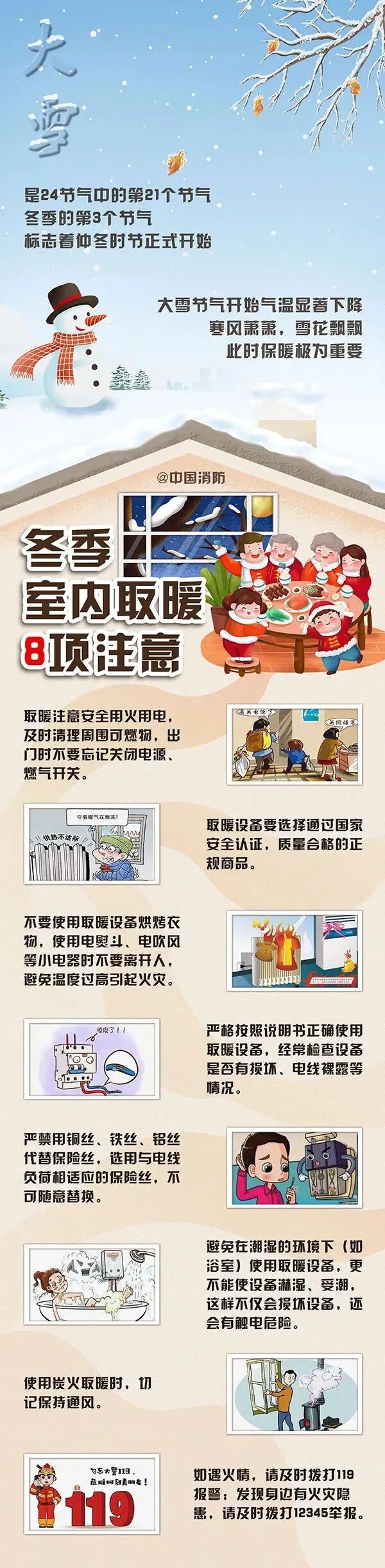 今日大雪节气。大雪是农历二十四节气中的第二十一个节气,属于冬季的第三个节气。俗话说“风后暖,雪后寒。”《月令七十二候集解》:“大雪,十一月节,至此而雪盛也。”大雪的意思是天气更冷,降雪的可能性比小雪时更大了,并不指降雪量一定很大。大雪节气开始,气温显著下降此时保暖极为重要大家在使用各种取暖设备时呈像应急提醒您勿忘消防安全来源:中国消防